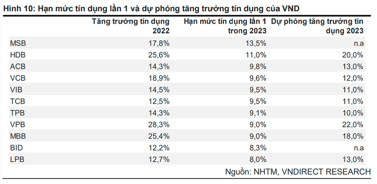 Room tín dụng của các ngân hàng khác, theo VNDirect, là HDBank (11%), ACB (9,8%), Vietcombank (9,8%), VIB (9,5%), Techcombank (9,5%), TPBank (9,1%), VPBank (9%), MB (9%), BIDV (8,3%), LienVietPostBank (8%).