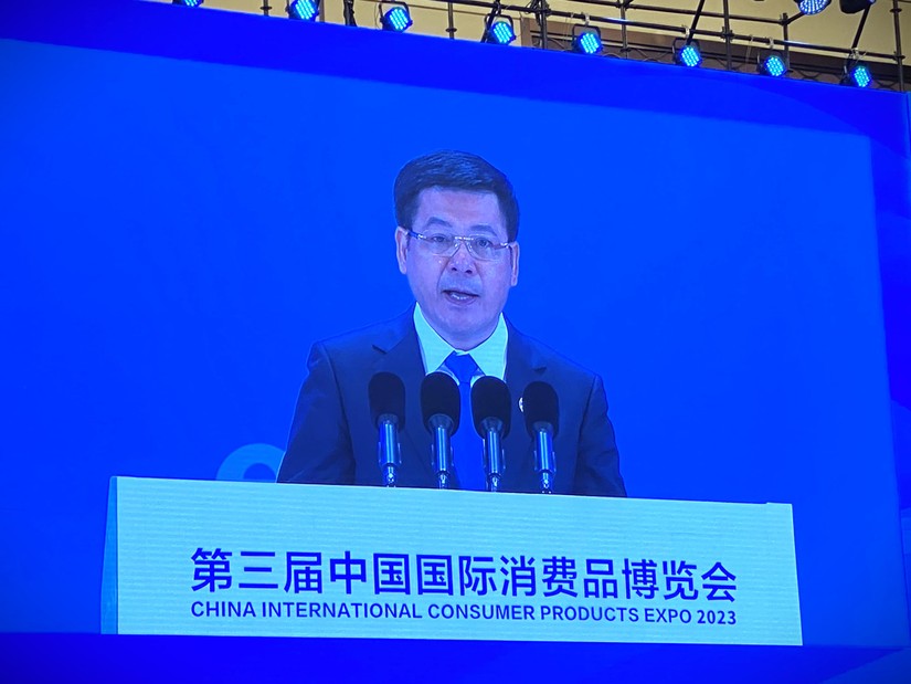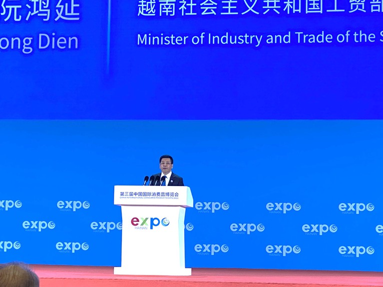 | Bộ trưởng Công Thương Nguyễn Hồng Diên tham dự và phát biểu tại Lễ khai mạc Hội chợ Hainan Expo 2023 vào ngày 10/4. Ảnh: Bộ Công Thương |