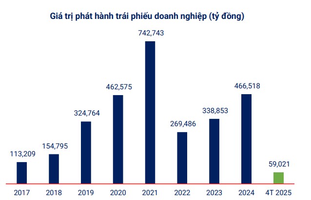 Tính chung 4 tháng đầu năm, doanh nghiệp phát hành 59.021 tỷ đồng trái phiếu doanh nghiệp. Như vậy, giá trị phát hành trái phiếu doanh nghiệp riêng lẻ chỉ trong tháng 4 chiếm gần 60% tổng giá trị phát hành thành công trong 4 tháng đầu năm 2025.