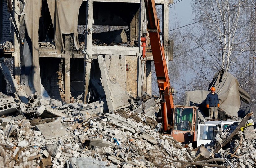 | Các công nhân dọn dẹp đống đổ nát được cho là tại tòa nhà trường dạy nghề ở Makiivka, tỉnh Donetsk. Ảnh: Reuters |