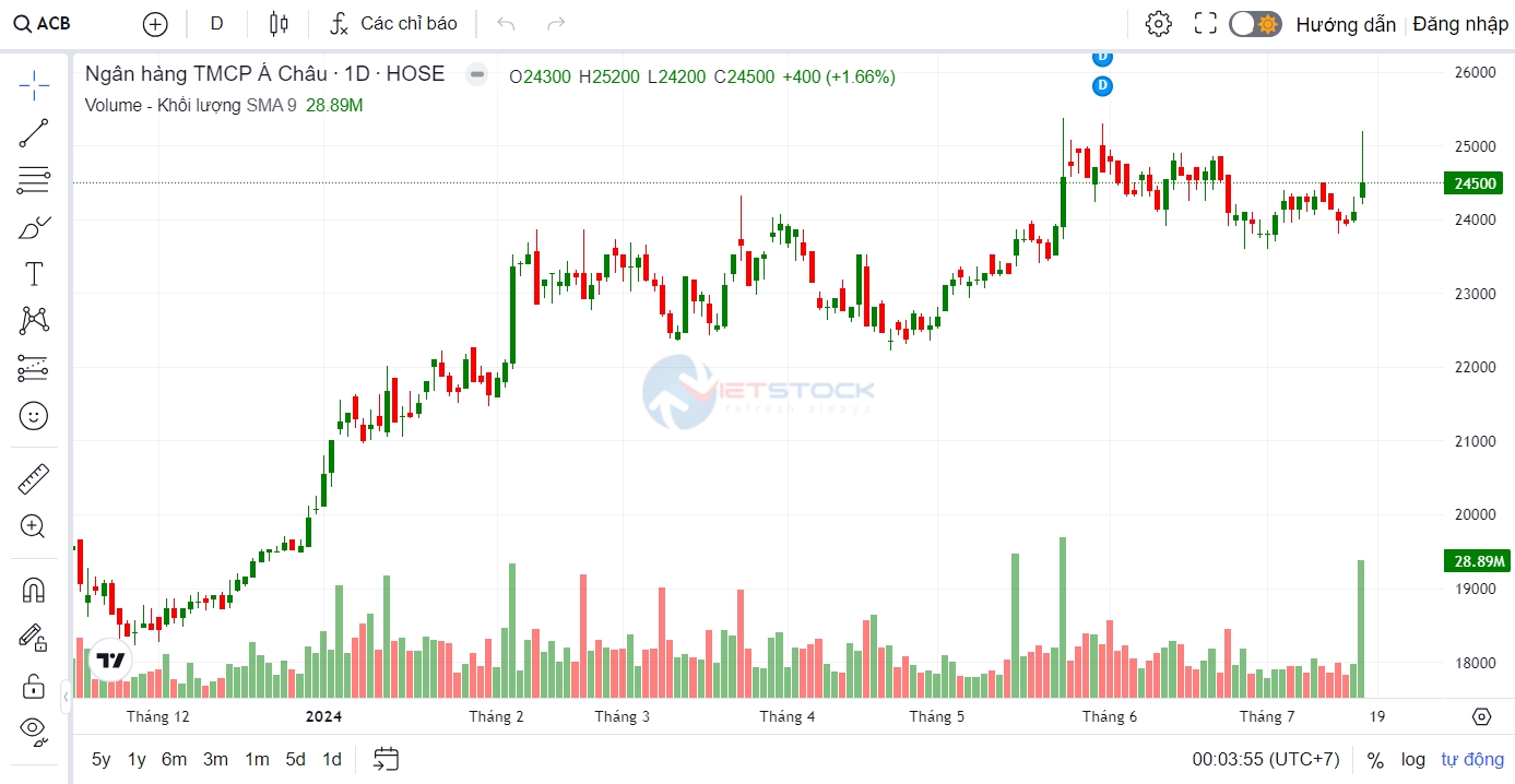 Trên thị trường chứng khoán, chốt phiên giao dịch ngày 17/7, cổ phiếu ACB đóng cửa ở mức 24.500 đồng/cổ phiếu, tăng 1,66% so với phiên liền kề.