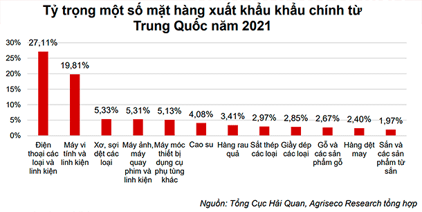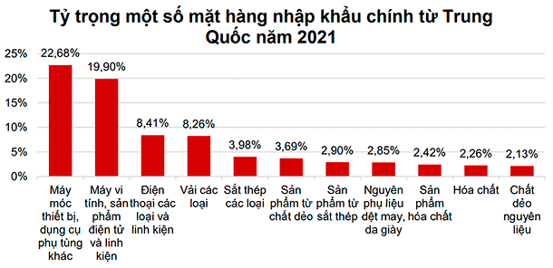 Thứ nhất, nhập khẩu hàng hóa từ Trung Quốc chiếm 33% tổng nhập khẩu (năm 2021), nước này cung ứng nguyên vật liệu cho rất nhiều ngành sản xuất như dệt may, da giày, hóa chất, thiết bị điện tử,… Như vậy, tốc độ tăng trưởng của lĩnh vực sản xuất có thể chậm lại nếu tình trạng phong tỏa còn kéo dài.