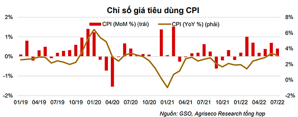 Rủi ro thứ năm, áp lực lạm phát và tỷ giá tại Việt Nam. Theo số liệu thống kê, CPI tháng 7 tăng 2,96% và 7 tháng 2022 tăng 2,44% so với cùng kỳ năm trước. Lạm phát gia tăng chủ yếu do giá xăng dầu trong nước từ đầu năm tăng cao hơn 50% so với cùng kỳ; giá hàng hóa và tiêu dùng thiết yếu tăng theo giá nguyên vật liệu đầu vào và chi phí vận chuyển.