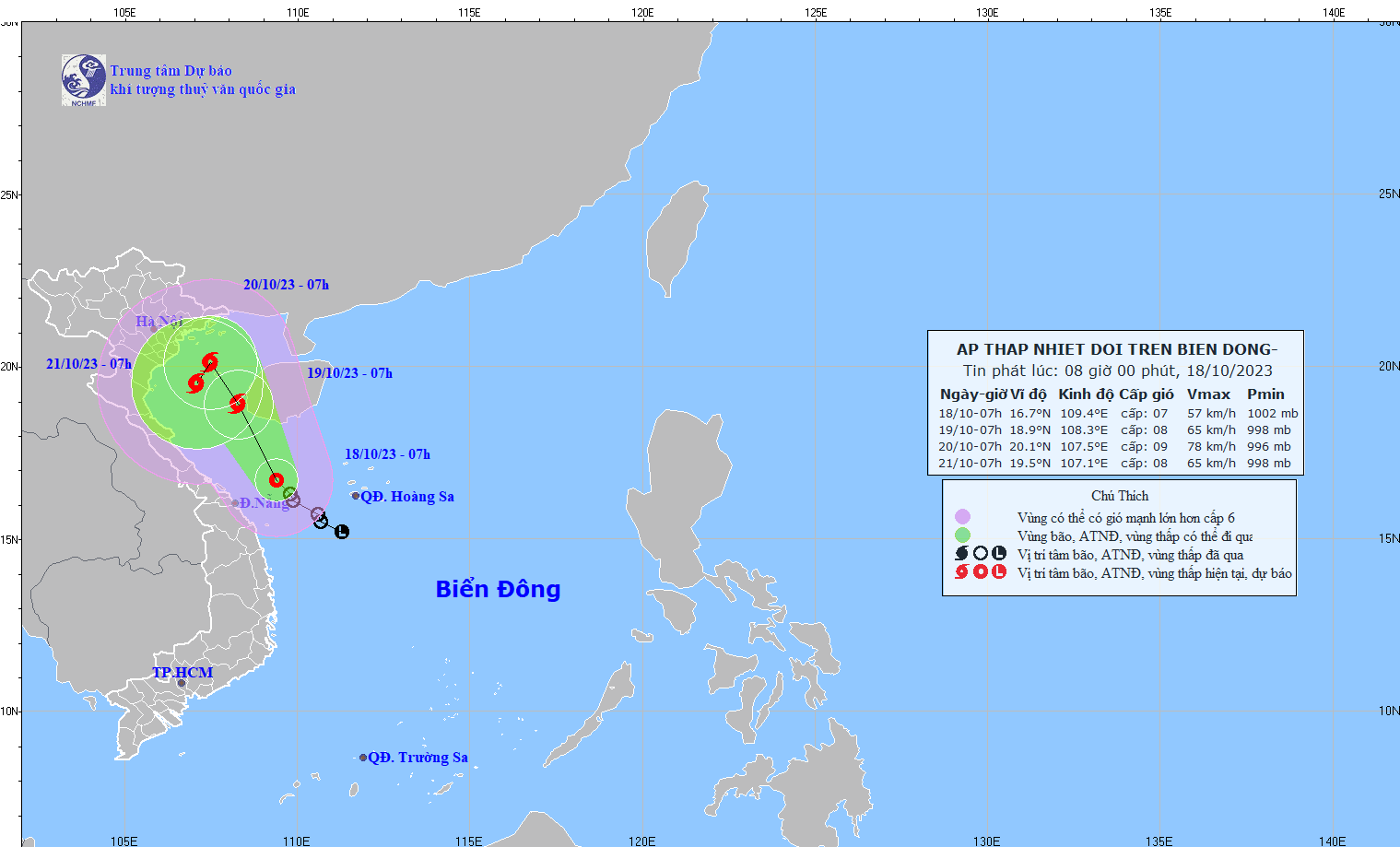 Trung tâm Dự báo Khí tượng Thủy văn cho biết trong vòng 24 giờ tới, áp thấp nhiệt đới di chuyển theo hướng Bắc Tây Bắc với tốc độ khoảng 10 km/h và có khả năng mạnh lên thành bão. Vị trí tâm áp thấp ở vào khoảng 18,9 độ Vĩ Bắc, 108,3 độ Kinh Đông; trên vùng biển phía Đông khu vực Vịnh Bắc Bộ. Sức gió vùng gần tâm áp thấp mạnh cấp 8, giật cấp 10.