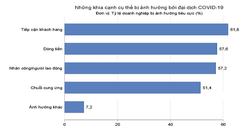 Về lao động, 90,8% doanh nghiệp tham gia khảo sát cho biết đã buộc phải giảm quy mô lao động trong thời kỳ dịch bệnh. Đối với hoạt động sản xuất kinh doanh, 96,2% doanh nghiệp thừa nhận gặp ít nhất một trong các vấn đề liên quan đến chuỗi giá trị, như khả năng tiếp cận khách hàng, dòng tiền, đứt gãy chuỗi cung ứng.