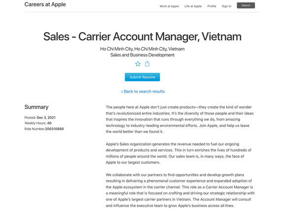 Trên ứng dụng LinkedIn, Apple đăng các thông báo tuyển dụng 12 vị trí nhân sự tại thị trường Việt Nam bao gồm các vị trí chủ chốt như Giám đốc tiếp thị, Giám đốc phát triển sản phẩm… Ngoài ra, Apple cũng tìm kiếm các vị trí kỹ sư Công nghệ lõi, tư vấn Pháp lý cho thị trường này.