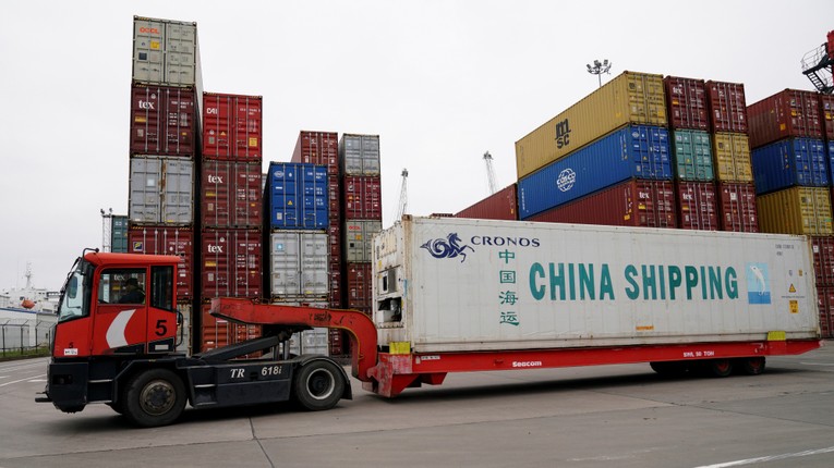 | Một chiếc xe tải vận chuyển một container của China Shipping Group tại một cảng thương mại ở thị trấn Baltiysk, Kaliningrad, Nga. Ảnh: Reuters |