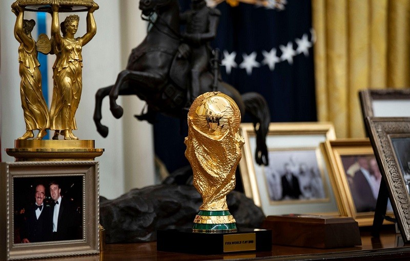 | Mô hình chiếc cúp vàng World Cup 2026 mà Chủ tịch FIFA Infantino tặng được Tổng thống Trump đặt trên chiếc bàn phía sau bàn làm việc. Ảnh: Bloomberg |