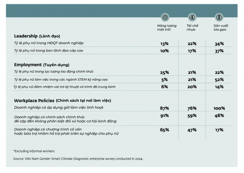 Phụ nữ cũng bị đánh giá thấp ở các vị trí lãnh đạo trong cả ba lĩnh vực trên. Trong số các doanh nghiệp được khảo sát, phụ nữ chỉ chiếm 21% vị trí quản lý cấp cao và 23% ghế trong hội đồng quản trị. Ngành năng lượng mặt trời có tỷ lệ phụ nữ lãnh đạo thấp nhất, tiếp theo là tái chế nhựa và sản xuất lúa.