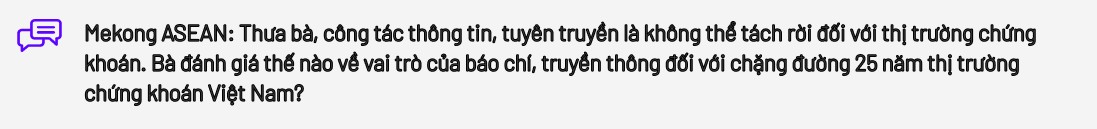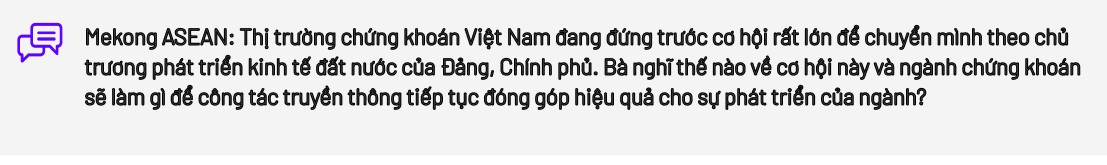 Trong suốt hành trình phát triển này, báo chí luôn đóng vai trò cầu nối giữa cơ quan quản lý và nhà đầu tư, lan tỏa thông tin minh bạch, thúc đẩy sự phát triển của thị trường. Nhân dịp kỷ niệm 100 năm ngày Báo chí Cách mạng Việt Nam, Mekong ASEAN có cuộc trò chuyện với bà Vũ Thị Chân Phương - Chủ tịch Ủy ban Chứng khoán Nhà nước (UBCKNN) về sự đồng hành của báo chí trong việc phát triển thị trường chứng khoán Việt Nam.