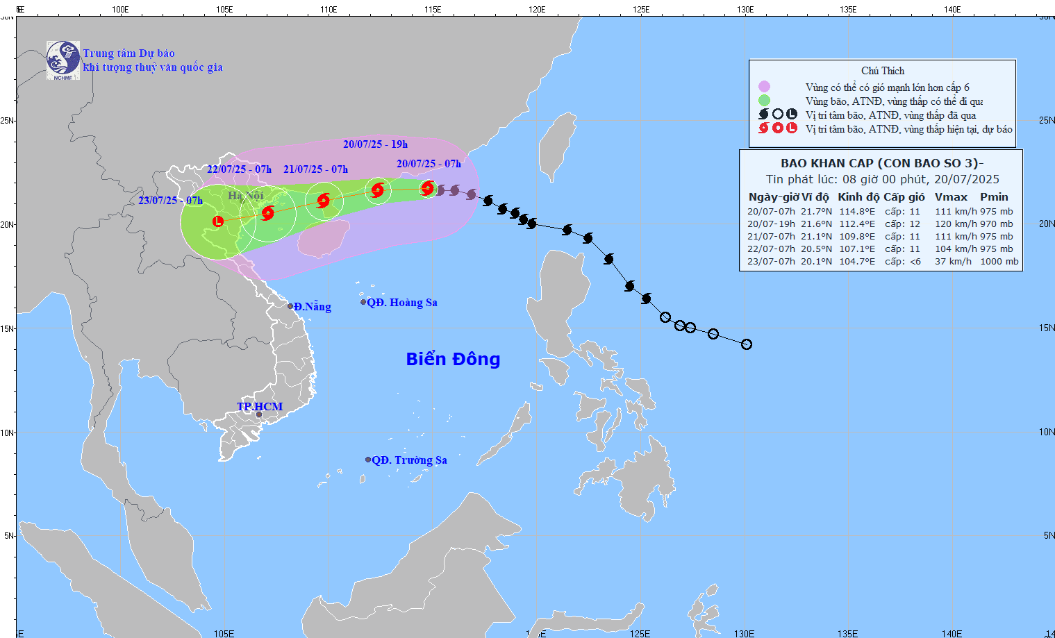 Đến 7h ngày 22/7, bão số 3 duy trì cường độ với sức gió mạnh nhất vùng gần tâm bão cấp 10-11 (103-117km/h), giật cấp 14, tâm bão nằm trên vùng ven biển Quảng Ninh - Ninh Bình. Khu vực chịu ảnh hưởng là vùng biển phía Tây Bắc khu vực Bắc Biển Đông, vùng biển vịnh Bắc Bộ, mức độ rủi ro thiên tai cấp 3.