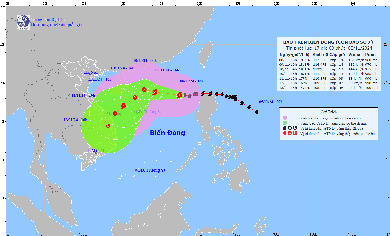 Đến 16h ngày 9/11, tâm bão số 7 sẽ nằm trên khu vực Bắc Biển Đông, cách quần đảo Hoàng Sa khoảng 420 km, sức gió mạnh nhất vùng gần tâm bão giật cấp 13-14, giật cấp 17. Khu vực chịu ảnh hưởng là khu vực Bắc Biển Đông, bao gồm vùng biển quần đảo Hoàng Sa.