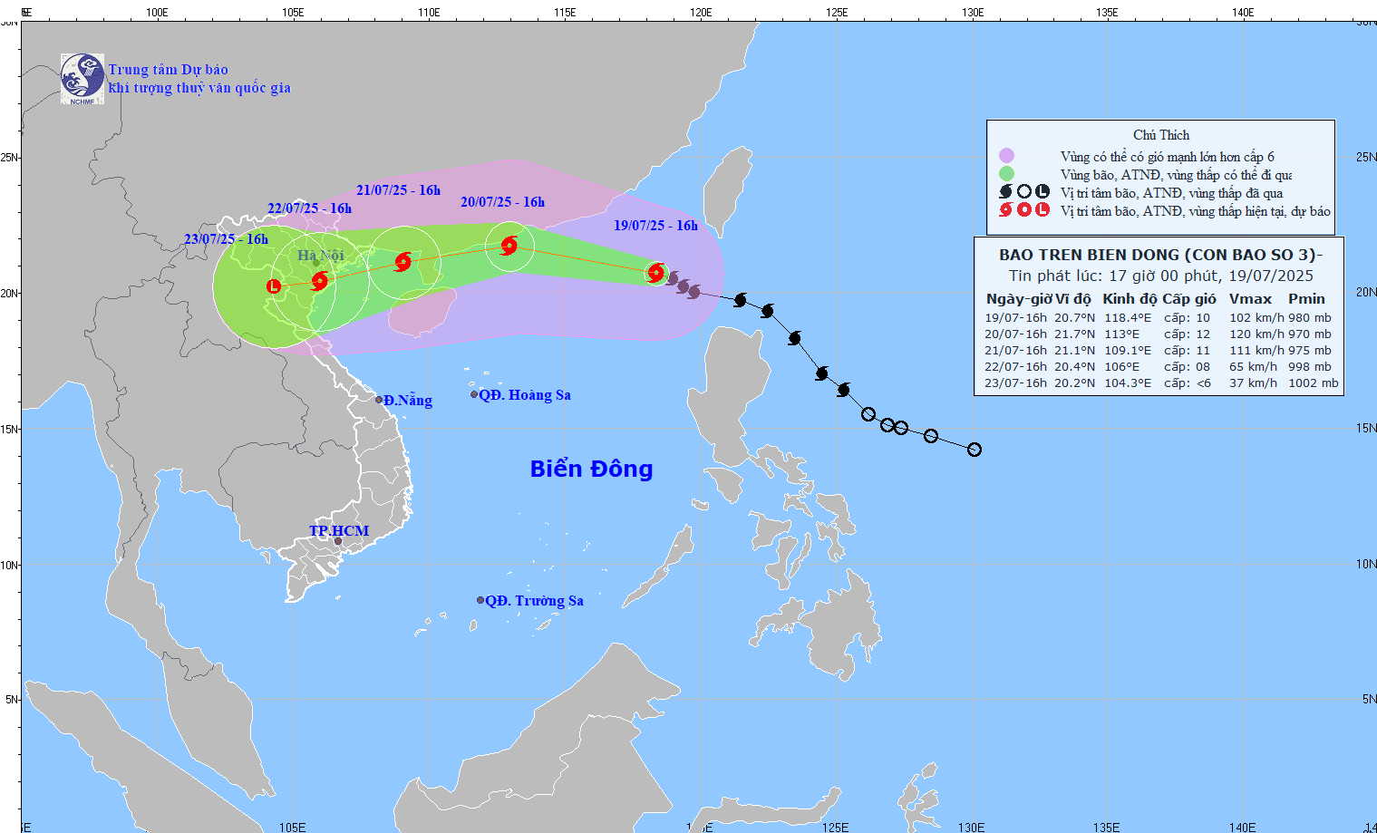 Cụ thể, vào 16h chiều nay (19/7), tâm bão số 3 (tên quốc tế là Wipha) nằm trên vùng biển phía Đông Bắc khu vực Bắc Biển Đông với sức gió mạnh nhất vùng gần tâm bão cấp 10 (89–102km/h), giật cấp 12. Bão tiếp tục di chuyển theo hướng Tây Tây Bắc với tốc độ khoảng 20km/h.