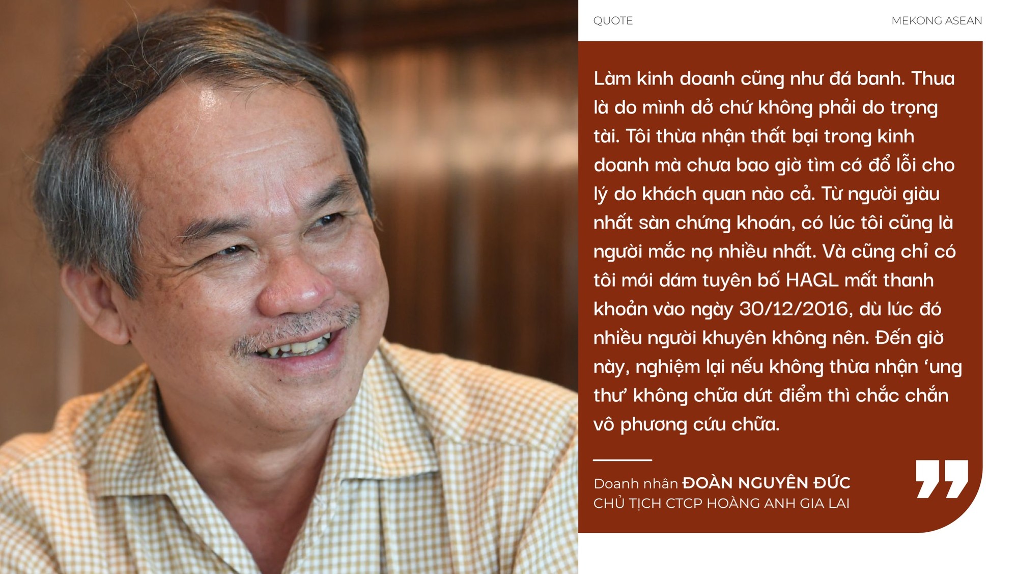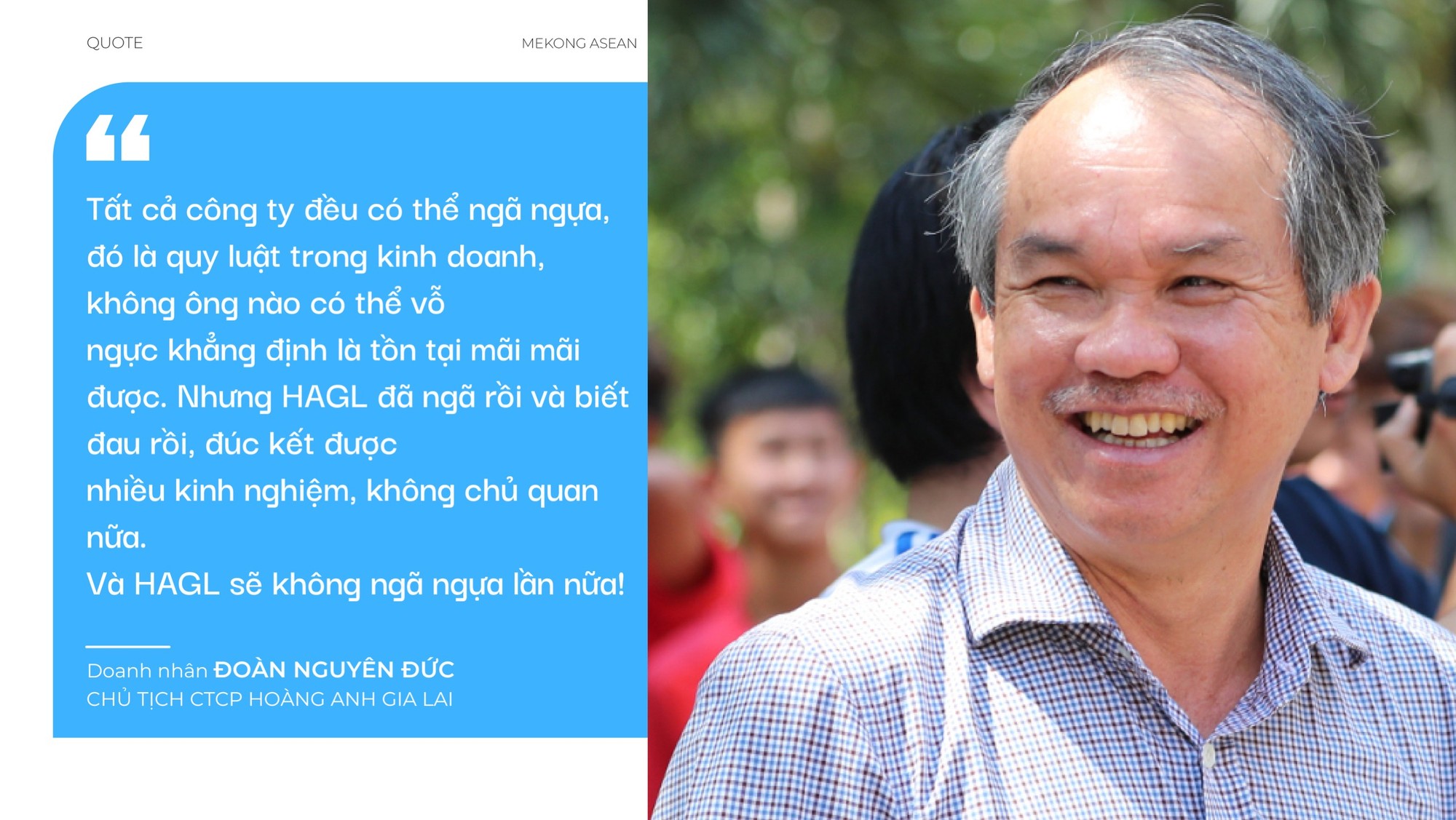 "Hồi đó nuôi bò lời dữ lắm, thậm chí bán phân bò cũng đủ tiền trả cho nhân công. Nhưng lúc đó HAGL bị mất thanh khoản mảng cao su nên ngân hàng họ "khoá sổ", cứ bán được con bò nào thu luôn tiền con đấy. HAGL không xoay vòng vốn được, không thể tái đàn nổi", bầu Đức trần tình.