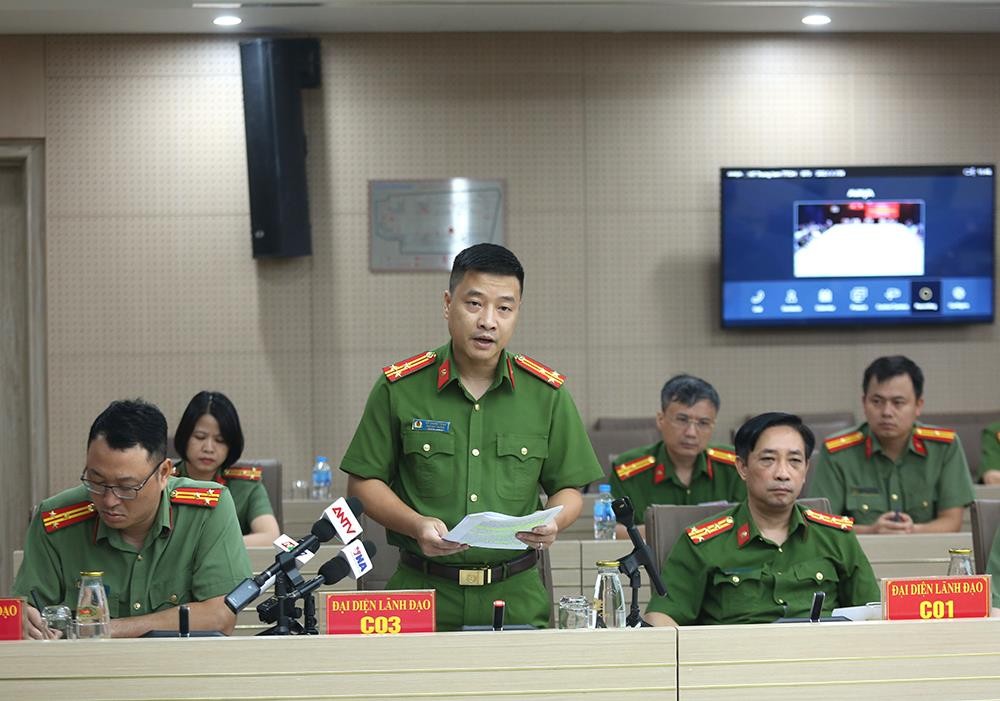 | Thượng tá Vũ Thanh Tùng thông tin tại họp báo. Ảnh: Bộ Công an |