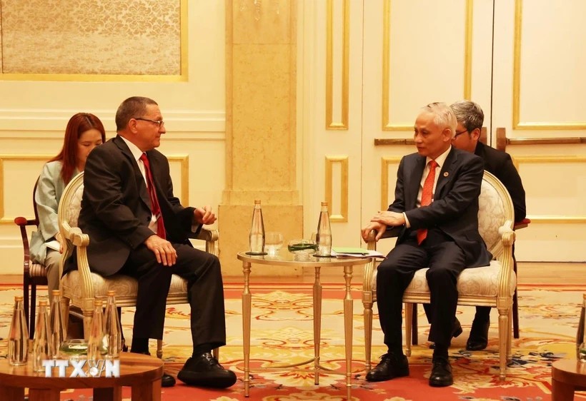 | Ông Lê Hoài Trung, Bí thư Trung ương Đảng, Chánh Văn phòng Trung ương Đảng tiếp ông Miguel Mejia, Tổng Bí thư Đảng Phong trào Cánh tả Cộng hòa Dominicana. Ảnh: TTXVN. |