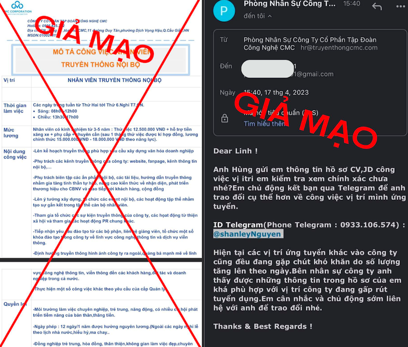 Sau khi tiếp cận ứng viên, nhóm lừa đảo gửi thông báo yêu cầu tham gia nhóm chat trên ứng dụng Telegram để các ứng viên phải cung cấp thông tin cá nhân như họ tên, số điện thoại, số tài khoản ngân hàng và tên ngân hàng nhằm trao đổi thông tin và nộp một khoản phí ứng tuyển tại CMC.