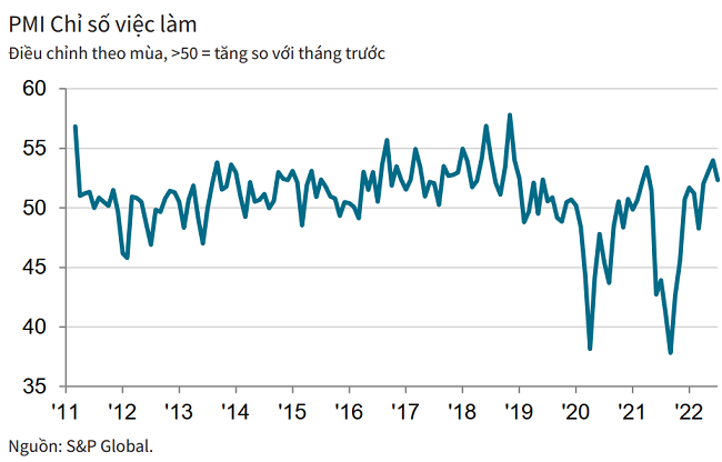 Báo cáo của S&P Global cũng cho thấy, các nhà sản xuất tiếp tục tăng lực lượng lao động để đáp ứng yêu cầu sản xuất, và đây là tháng tăng thứ tư liên tiếp. Mức độ tạo thêm việc làm là mạnh mặc dù đã chậm lại so với mức cao của ba năm rưỡi được ghi nhận trong tháng 6.