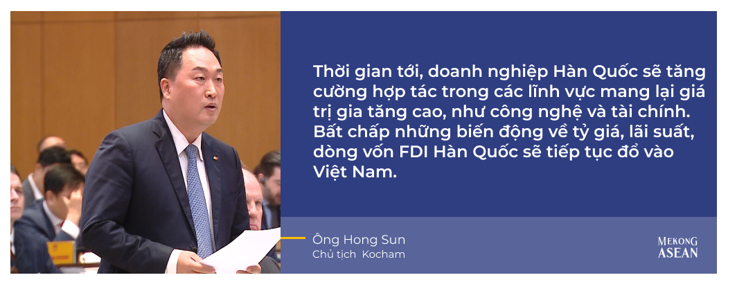 Ông Hong Sun, Chủ tịch Hiệp hội Doanh nghiệp Hàn Quốc tại Việt Nam (Kocham) chia sẻ với Mekong ASEAN rằng, Việt Nam đã tạo được một môi trường đầu tư năng động, thân thiện và là nơi các nhà đầu tư Hàn Quốc sẽ thấy được tiềm năng tăng trưởng trong dài hạn.
