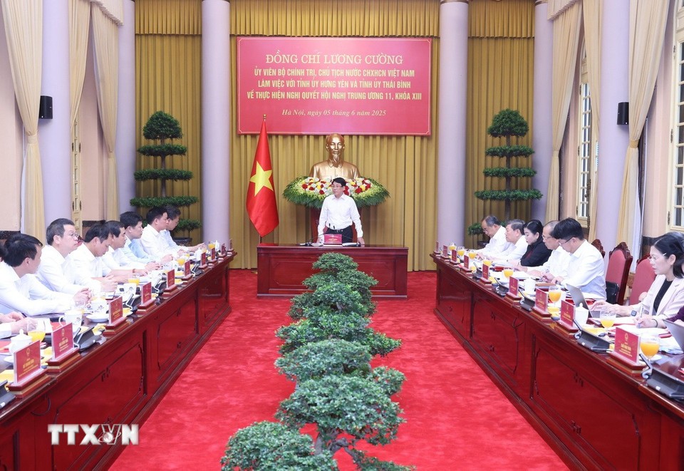Chiều 5/6, tại Phủ Chủ tịch, Chủ tịch nước Lương Cường và đoàn công tác Trung ương đã làm việc với Tỉnh ủy Hưng Yên và Thái Bình về thực hiện Nghị quyết Hội nghị lần thứ 11 Ban Chấp hành Trung ương Đảng khóa XIII gắn với việc xây dựng, hoàn thiện văn kiện, công tác nhân sự.