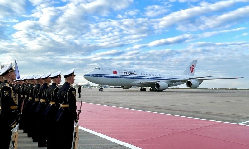 | Máy bay của Chủ tịch Tập Cận Bình hạ cánh xuống Moscow. Ảnh: Tân Hoa xã |