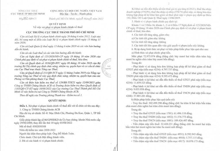 Với các lỗi trên, ACBS bị xử phạt gần 73 triệu đồng, đồng thời bị truy thu thuế số tiền hơn 302 triệu đồng.