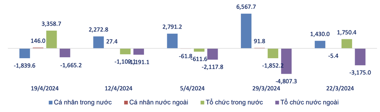 | Giá trị ròng theo loại hình nhà đầu tư 5 tuần gần nhất (tỷ đồng). Nguồn: SHS |
