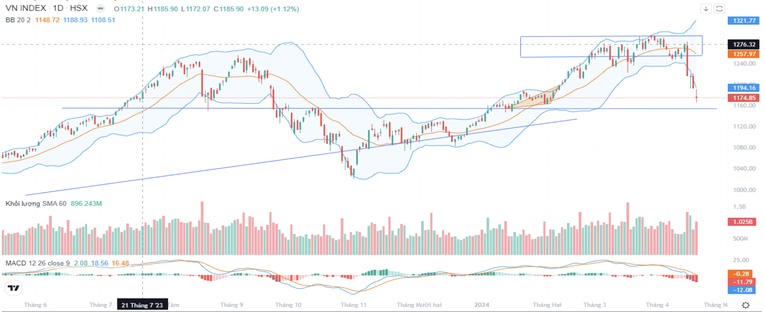 Theo Chứng khoán Rồng Việt (VDSC), thị trường tiếp tục theo chiều hướng suy giảm nhưng có dao động mạnh quanh MA(200) 1.176 điểm. Thanh khoản phiên thứ Sáu tăng so với phiên trước với nến star, cho thấy có diễn biến tranh chấp giữa cung và cầu khi thị trường giảm nhanh về vùng MA(200).