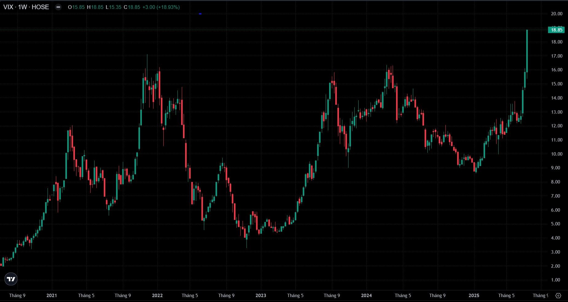 Khoản lãi kỷ lục của quý 2/2025 tiếp lực cho cổ phiếu VIX trên thị trường chứng khoán. Phiên 18/7, dù VN-Index chỉ tăng 0,49% và lỡ hẹn với ngưỡng 1.500 điểm, VIX tăng kịch biên độ lên 18.850 đồng/CP – mức cao nhất trong lịch sử, với hơn 65 triệu cổ phiếu được giao dịch khớp lệnh, tương đương giá trị 1.203 tỷ đồng.