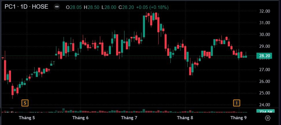 Trên thị trường chứng khoán, sau khi có nhịp tăng từ 26.500 lên tiệm cận ngưỡng 30.000 đồng/CP trong nửa đầu tháng 8/2024, cổ phiếu PC1 đang có tín hiệu điều chỉnh nhẹ, khi giảm 5/8 phiên gần nhất. Chốt phiên 10/9, PC1 tăng 0,18% lên 28.200 đồng/CP, tương đương vốn hóa 8.770 tỷ đồng.