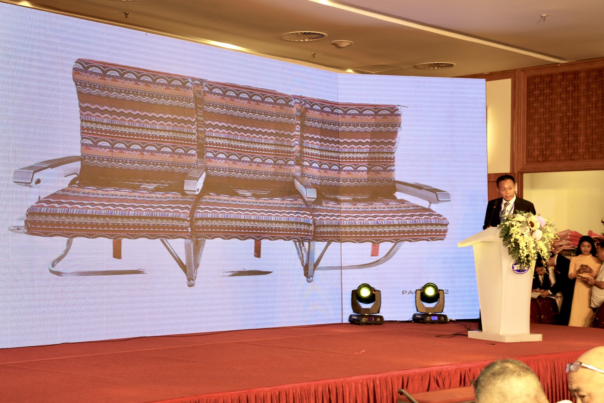 | Ông Trần Hải Đăng, Tổng Giám đốc Công ty Cổ phần Dịch vụ Kỹ thuật Hàng không (AESC) trình bày ý tưởng đưa vải thổ cẩm lên máy bay thương mại tại Triển lãm hàng không quốc tế (VIAE) 2022. |