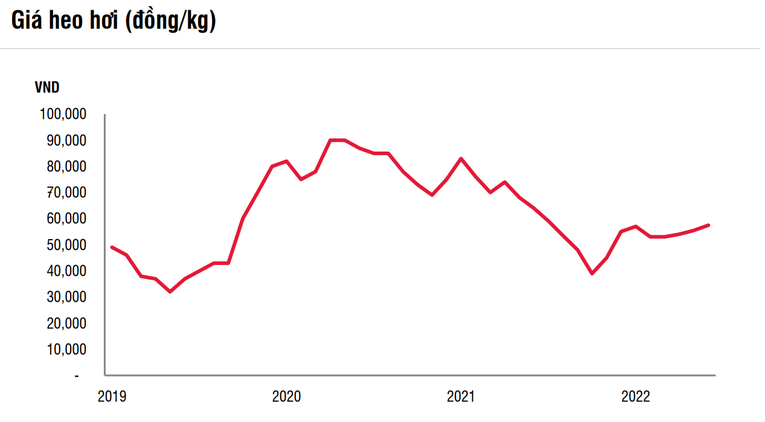 Công ty chứng khoán ước tính giá lợn hơi sẽ đạt khoảng 65-70 nghìn đồng/kg trong nửa cuối năm 2022 (tăng 30% so với cùng kỳ vì nửa cuối năm 2021 có mức nền thấp). Về phía nguồn cung, giá nguyên liệu thô như ngô, lúa mì và đậu nành đã giảm lần lượt -7%/- 30%/- 8% so với mức đỉnh. SSI cho rằng chi phí thức ăn chăn nuôi sẽ đi ngang và bắt đầu giảm trong quý 4/2022. Do đó, chi phí chăn nuôi sẽ giảm trong nửa cuối năm 2022, trong khi giá thịt hơi dự kiến sẽ tăng chậm đến cuối năm. Nhờ vậy, các công ty chăn nuôi sẽ bắt đầu phục hồi trong nửa cuối năm 2022.