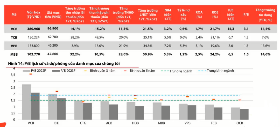 Chia sẻ tại Market Talk 17 " Điểm sáng ngành ngân hàng nửa cuối năm 2022" mới đây, ông Nguyễn Minh Hiếu - Chuyên viên tư vấn Khách hàng Cá Nhân Chứng khoán Rồng Việt (VDSC), đã chỉ ra 4 cổ phiếu có cơ hội đầu tư tốt trong nửa cuối năm 2022 bao gồm VCB, TCB, VPB và MBB.
