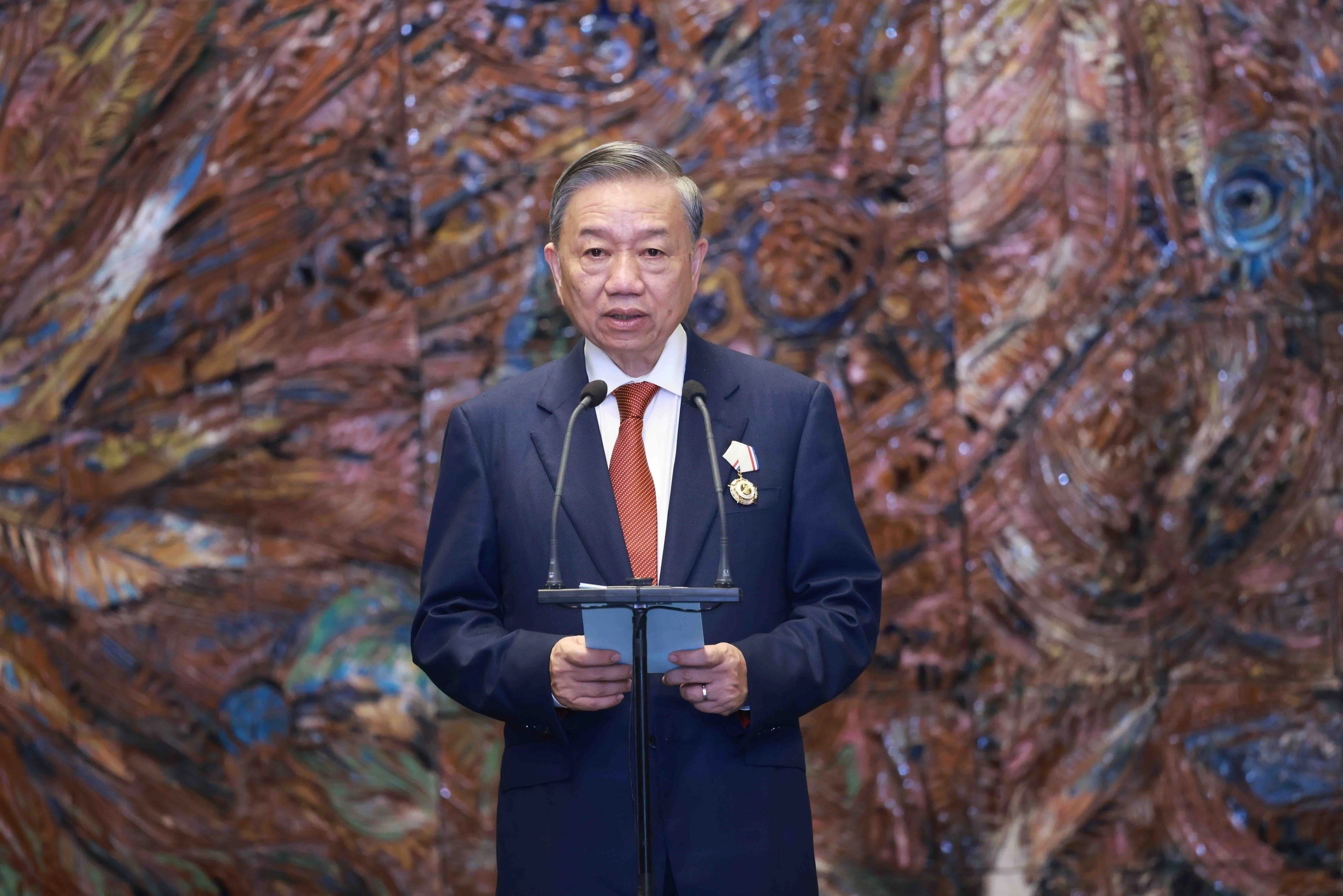 Phát biểu tại buổi lễ, Tổng Bí thư, Chủ tịch nước Tô Lâm bày tỏ xúc động và vinh dự được đón nhận Huân chương cao quý nhất của Đảng và Nhà nước Cuba do Bí thư thứ nhất, Chủ tịch nước Miguel Diaz Canel trực tiếp trao tặng.