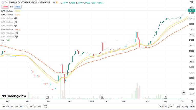 | Kết phiên 9/6, cổ phiếu DTL giảm 0,9% và giao dịch ở mức 34.500 đồng/cp, tương đương vốn hóa gần 2.120 tỷ đồng. Ảnh: TradingView |