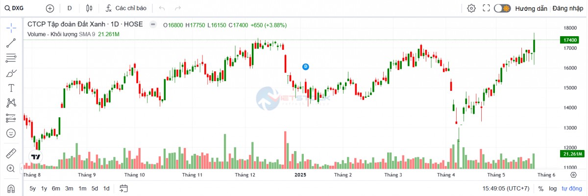 Trên thị trường chứng khoán, trước thông tin sắp nhận cổ phiếu thưởng, mã DXG vừa có phiên tăng 3,28%, lên 17.350 đồng/cổ phiếu chốt phiên 26/5, xác lập đỉnh mới của một năm trở lại đây. Vốn hoá doanh nghiệp chính thức vượt mốc15.000 tỷ đồng.