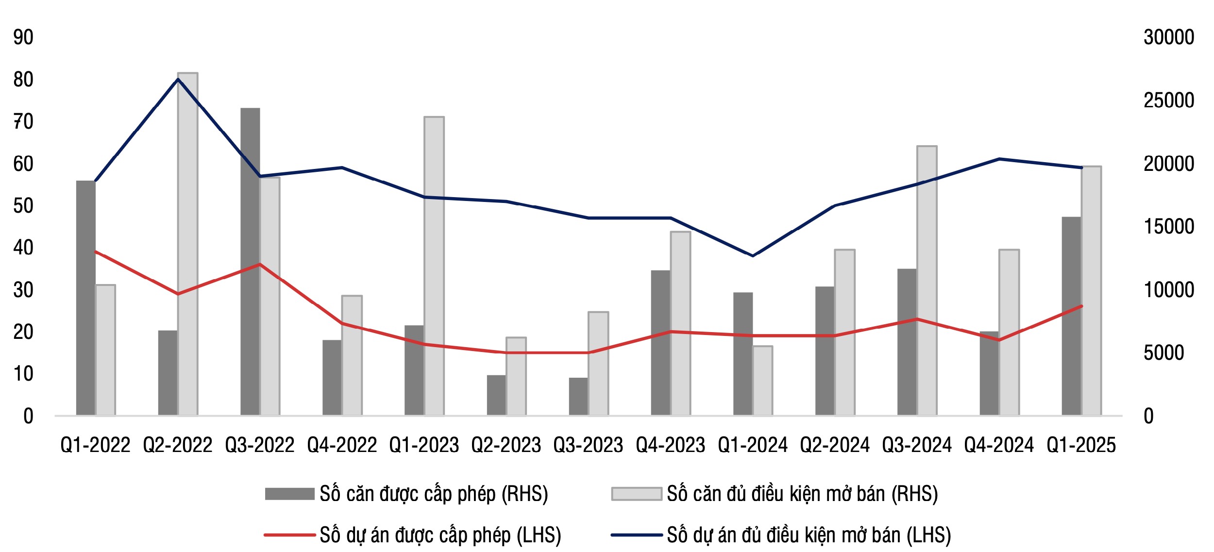 | Số lượng dự án mới được phê duyệt và cấp phép bán hàng trong giai đoạn 2022 - quý 1/2025. Nguồn: SSI |