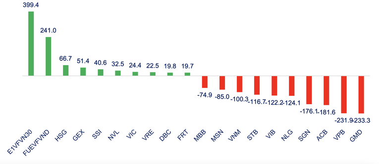 Ở tuần qua, khối ngoại vẫn tập trung bán ròng mạnh nhất ở SSI (276 tỷ đồng), VHM (160 tỷ đồng), VRE (148 tỷ đồng)… Ngược lại mua ròng mạnh nhất ở HPG với giá trị 269 tỷ đồng, kế đến là VIC (264 tỷ đồng), VNM (215 tỷ đồng)…