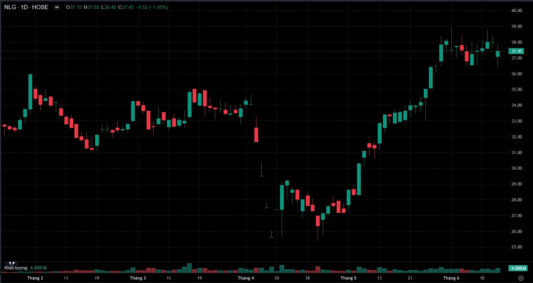 Trên thị trường chứng khoán, cổ phiếu NLG vừa chứng kiến nhịp tăng mạnh mẽ từ hạ tuần tháng 4 đến hết tháng 5/2025, đưa thị giá từ 26.000 đồng/CP lên vượt ngưỡng 38.000 đồng/CP, tương ứng mức tăng 31,6%.