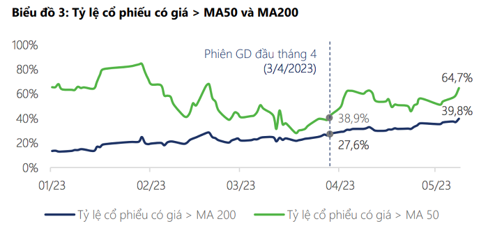 Tuy thị trường điều chỉnh, DSC nhận thấy có một điểm tích cực trong tháng 4 là cấu trúc thị trường đã được cải thiện. Trong hơn một tháng, tỷ lệ cổ phiếu vượt mốc cản MA50 tăng mạnh từ 38,9% lên tới 64,7%. Tỷ lệ cổ phiếu vượt mốc cản trung hạn MA200 cũng tăng đáng kể từ 27,6% lên tới 39,8%.