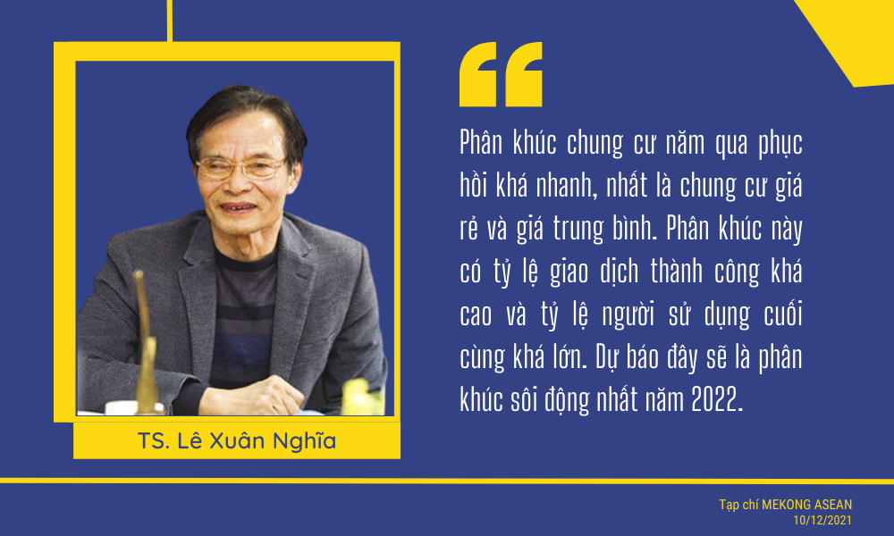 Phân khúc chung cư năm qua phục hồi khá nhanh, nhất là chung cư giá rẻ và giá trung bình. Phân khúc này có tỷ lệ giao dịch thành công khá cao và tỷ lệ người sử dụng cuối cùng khá lớn. Dự báo đây sẽ là phân khúc sôi động nhất năm 2022.