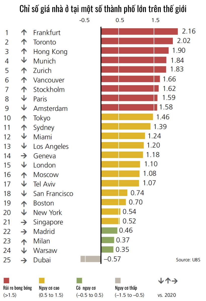 Chỉ số bong bóng bất động sản toàn cầu mới nhất cập nhật bởi UBS Global Wealth Management hồi giữa tháng 10/2021 phân tích giá bất động sản tại 25 thành phố lớn trên thế giới cho thấy tốc độ tăng giá nhà từ giữa năm 2020 đến giữa năm 2021 tại các thành phố này lên tới 6% (đã trừ yếu tố lạm phát). Đây là mức tăng hàng năm lớn nhất kể từ năm 2014.