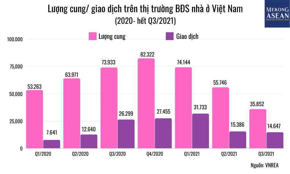 | Lượng cung trên thị trường BĐS nhà ở giảm mạnh trong 9 tháng đầu năm 2021, số giao dịch cũng giảm mạnh nhất là trong quý II và quý III (Nguồn: VNREA) |