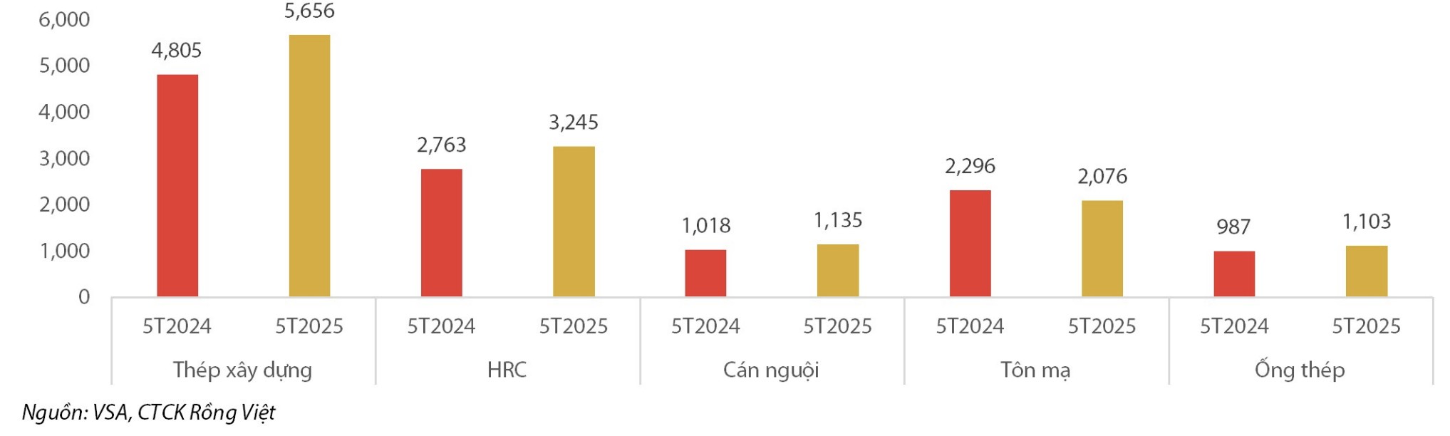 Trong báo cáo triển vọng ngành thép của Chứng khoán Rồng Việt (VDSC) mới công bố cho biết, tính chung 5 tháng đầu năm 2025, sản xuất thép thành phẩm của Việt Nam đạt 13.016 triệu tấn, tăng 9% so với cùng kỳ năm trước (YoY). Trong đó, sản lượng bán hàng các nhóm sản phẩm thép (ngoài tôn mạ) đều ghi nhận sự tăng trưởng với động lực chủ yếu từ thị trường nội địa, nhờ nhu cầu ổn định từ hoạt động xây dựng trong nước.