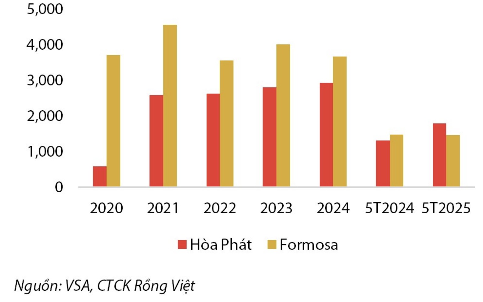 Về thép cuộn cán nóng (HRC), sản lượng của Hòa Phát đạt 1,8 triệu tấn (tăng 37% YoY), trong khi con số của Formosa chỉ đi ngang. Kể từ tháng 3/2025, Hòa Phát đã chính thức vượt qua Formosa để trở thành doanh nghiệp có thị phần HRC lớn nhất Việt Nam (đây là hai doanh nghiệp duy nhất sản xuất HRC trong nước), được hỗ trợ bởi mức thuế chống bán phá giá với HRC Trung Quốc và nhu cầu tiêu thụ ổn định cho các sản phẩm từ nhà máy Dung Quất 2. Ngược lại, sản lượng xuất khẩu HRC của Hòa Phát lại giảm 48% YoY, chỉ đạt 232.000 tấn, do ảnh hưởng của biện pháp phòng vệ thương mại tại thị trường EU.