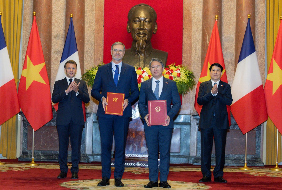 Ngay sau hội đàm, Chủ tịch nước Lương Cường và Tổng thống Emmanuel Macron cùng đoàn đại biểu cấp cao hai nước đã chứng kiến Lễ trao các văn kiện hợp tác song phương, bao gồm: