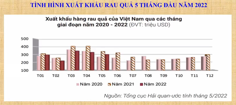 Đã có 9 sản phẩm, nhóm sản phẩm đạt giá trị xuất khẩu trên 1 tỷ USD (cà phê, cao su, gạo, điều, nhóm rau quả, cá tra, tôm, sản phẩm gỗ và nhóm đầu vào phục vụ sản xuất). Trị giá xuất khẩu hàng rau quả của Việt Nam trong 5 tháng đầu năm ước đạt 1,47 tỷ USD (giảm 13,6% so với cùng kỳ năm 2021).