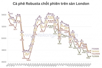 Kết phiên, giá cà phê Robusta trên sàn London giảm 2,32% so với tham chiếu, còn 5.010 USD/tấn cho kỳ hạn giao tháng 7/2025; kỳ hạn giao tháng 9/2025 cũng giảm 2,04%, đạt 4.987 USD/tấn. Cà phê giao kỳ hạn tháng 11/2025 giảm 1,98%, xuống mức 4.942 USD/tấn; tháng 1/2026 giảm 1,98%, đạt 4.859 USD/tấn.