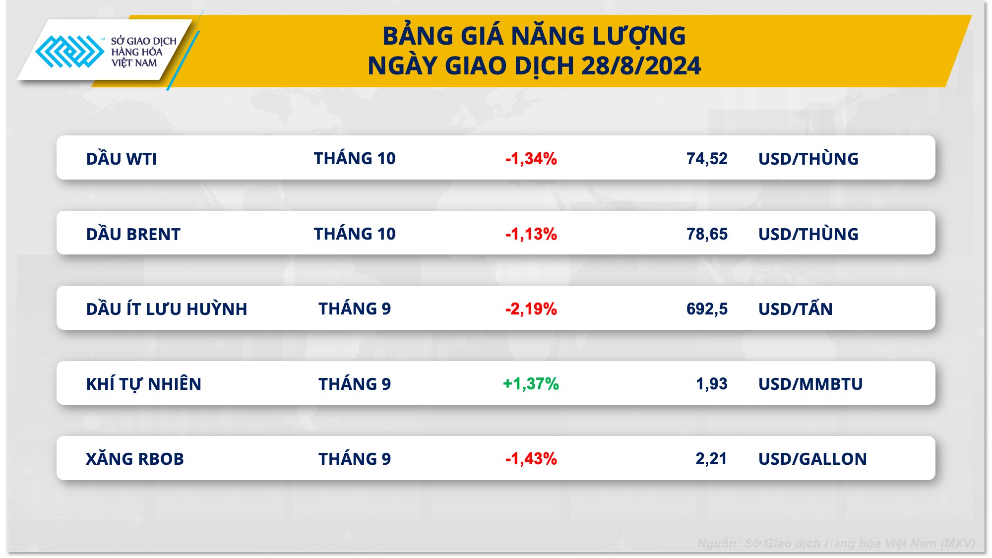 Kết phiên giao dịch ngày 28/8, giá dầu thô Brent giảm 1,13% so với phiên hôm trước, xuống 78,65 USD/thùng. Giá dầu thô WTI giảm 1,01 USD, tương đương 1,34%, xuống mức 74,52 USD. Đà giảm diễn ra trong bối cảnh giá dầu thế giới nối dài đà suy yếu khi số liệu tồn kho của Mỹ giảm ít hơn so với kỳ vọng cùng với áp lực tăng trưởng nhu cầu.