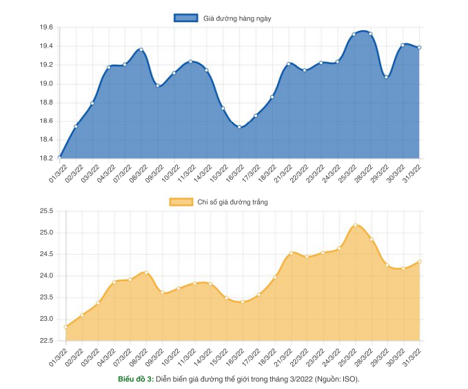 Giá đường thế giới được ghi nhận tăng vọt trở lại trong tháng 3/2022 sau hai tháng sụt giảm. Theo thông tin từ Tổ chức Đường Quốc tế (ISO), trong tháng 3, giá đường thô giao ngay đã tăng vọt lên mức cao nhất 4 tháng với trung bình 19,1 Cents/lb. Chỉ số giá đường trắng cũng tăng mạnh lên mức cao nhất trong 5 năm gần đây với 528,4 USD/tấn.